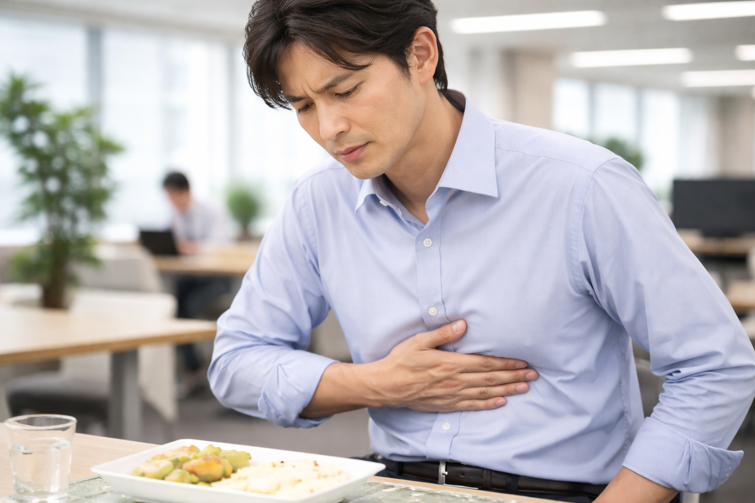 意外と見落としがちなのが、食後の過ごし方と日中の「姿勢」です。食後すぐに横になると、胃酸が逆流しやすくなり、みぞおち付近の不快感や胸焼けの原因となります。反対に、長時間のデスクワークなどで前かがみの姿勢を続けていると、物理的に胃や周りの臓器を圧迫し続け、血流を妨げて痛みを生じさせることがあります。猫背の状態は呼吸も浅くなりやすく、酸素が十分に体に行き渡らないため、疲れの回復も遅らせてしまいます。
